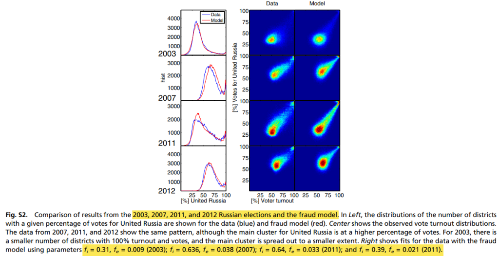 Jedna od prvih i najpoznatijih primena modela konačne mešavine odnosi se na izbore u Rusiji. Ovi izbori su dugi niz godina bili predmet sumnji zbog karakterističnih anomalija u raspodelama izlaznosti i rezultata. Najpoznatiji fenomen su tzv. „šiljci“ na histogramima izlaznosti i rezultata, gde se primećuje neuobičajena koncentracija biračkih mesta na okruglim vrednostima kao što su 90% ili 100% izlaznosti, uz gotovo apsolutnu podršku vladajućem kandidatu. Vizuelno, ovi obrasci ukazuju na mogućnost ballot stuffinga ili administrativnog uvećavanja rezultata. Međutim, pitanje je koliko su ovi obrasci zaista značajni u pogledu ishoda. Kada se primeni Mebaneov model konačne mešavine, izlaznost i udeo glasova za pobednika tretiraju se kao dvodimenzionalni raspored koji generiše kombinacija regularnog i neregularnog procesa. Rezultati su pokazali da značajan procenat glasova za pobednika potiče iz sumnjivih klasa, često više od trećine ukupnog rezultata. Na ovaj način, model ne samo da potvrđuje postojanje anomalija, već i daje kvantitativni odgovor na pitanje o njihovoj težini i potencijalnom uticaju na legitimitet izbora.