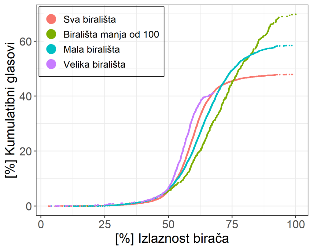 Na Slici 2. velika biračka mesta (ljubičasta), dostižu relativno visok plato (vizuelno, najviši među krivama opozicije), što ukazuje da opozicija stoji jače na većim biračkim mestima. Mala biračka mesta (plava), vidno niži plato, kriva se izravnava znatno ispod „Velikih“. Biračka mesta <100 (zelena), najsnažnija depresija: kumulativni udeo opozicije ostaje nizak i na vrhu ose izlaznosti.