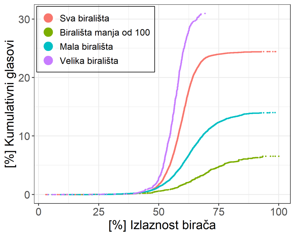 Zašto stratifikacija po veličini biračkog mesta pomaže? Mala biračka mesta su često organizaciono osetljivija (manji broj posmatrača, veća društvena povezanost, lakše ciljane mobilizacije). Ako baš u malim biračkim mestima kumulativna kriva vladajuće liste eksplodira pri visokim izlaznostima, dok u velikim ne, to je uzorak koji zaslužuje dodatnu proveru na terenu. Intuitivno tumačenje „normalnih“ krivih: za većinu stranaka/koalicija videćete S-oblik sa blagim zasićenjem; za sporne slučajeve, videćete kasno „penjanje“ i razdvajanje po veličinama biračkih mesta koje ne može lako da se objasni neutralnim faktorima (demografija, urbana/ruralna podela) bez dodatnih pretpostavki.