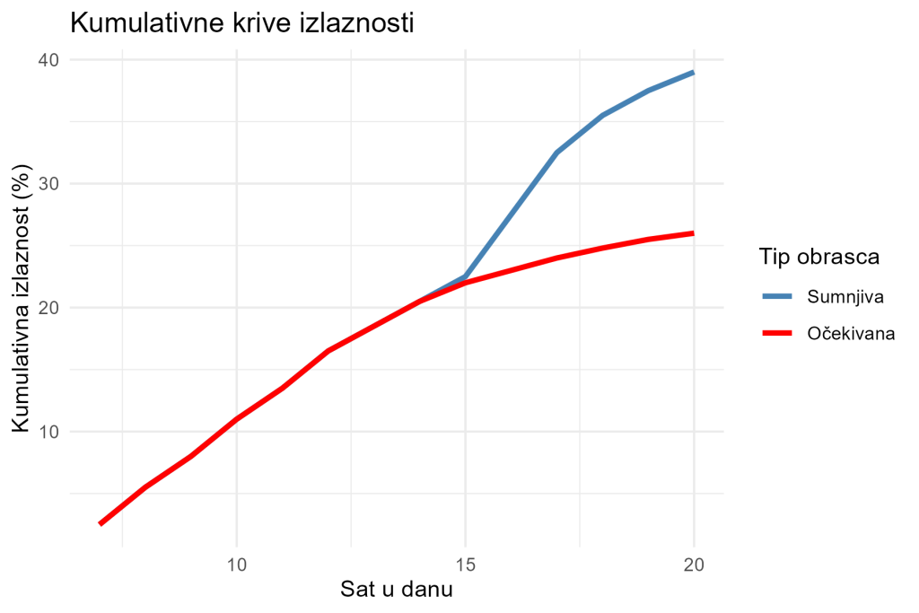 Ova kumulativna kriva vizualizuje razliku između regularnog i sumnjivog toka glasanja. Slika 1 ilustruje tu razliku.